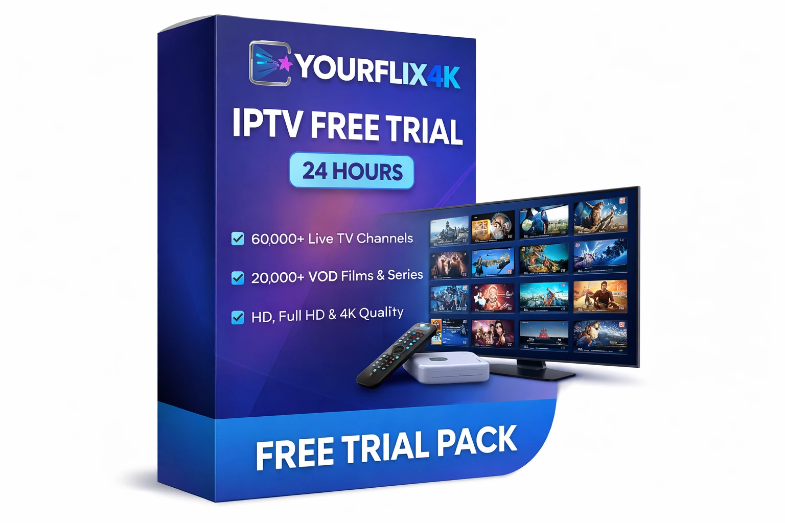 Test the full YOURFLIX4K experience with a 24-hour IPTV free trial. Explore live TV, films, series and sports in HD, Full HD and 4K before choosing a subscription.