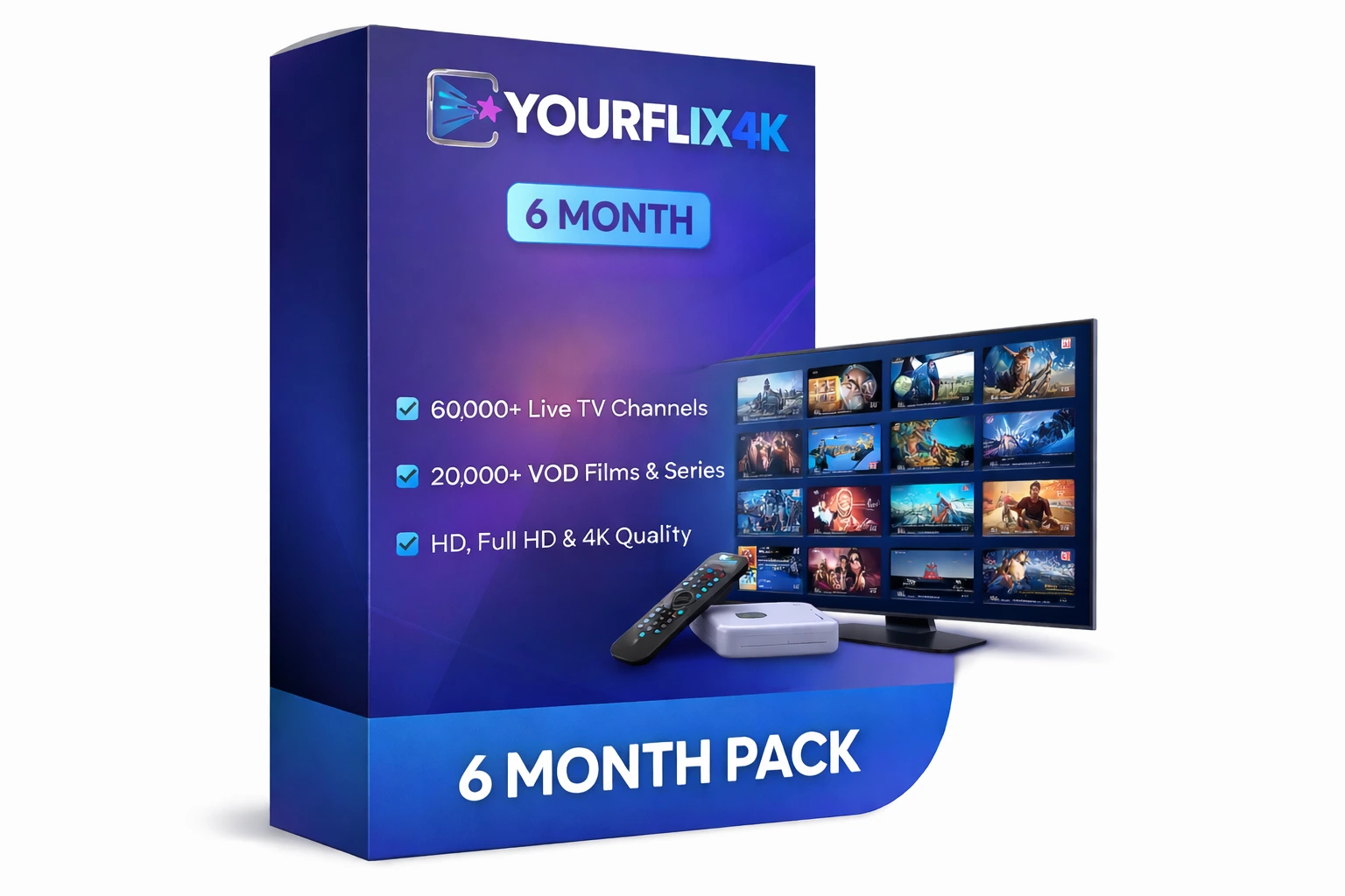 Enjoy uninterrupted premium entertainment with the YOURFLIX4K 6-Month IPTV Subscription. Stream thousands of live channels, films, series and sports in HD, Full HD and 4K, all from one reliable and easy-to-use service.
